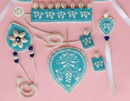 Product Title: Handcrafted Teal Blue ‘Alpana’ Style Fabric & Cowrie Shell Jewellery Set