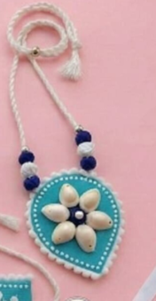 Long Necklace: A pendant necklace with a white braided cord, accented with blue pom-poms/beads and a statement pendant featuring a flower made of Cowrie shells.