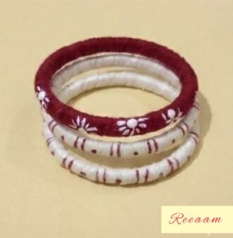 Bangles: Beautifully wrapped in thread in alternating maroon and white bands, detailed with delicate white hand-painted accents to match the main jewelry pieces.