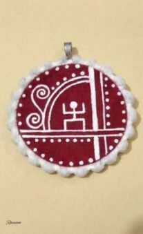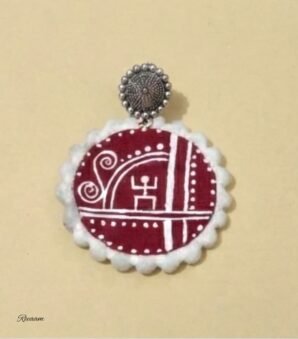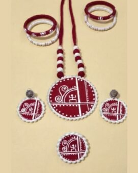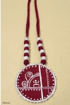 Statement Necklace: Features a large circular pendant with hand-painted Warli motifs (spirals and a dancing figure). It is suspended from a comfortable, adjustable dori (cord) adorned with alternating maroon and white fabric-wrapped beads.