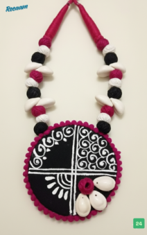 The necklace showcases a striking circular black pendant, hand-painted with intricate white folk motifs and bordered with vibrant magenta thread detailing. Natural shell beads, paired with black, white, and magenta thread-wrapped beads, add texture and earthy elegance to the piece.