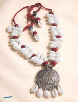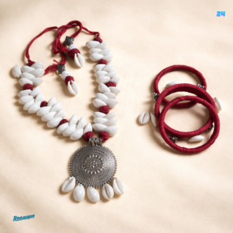 Enhance your ethnic charm with this beautifully handcrafted jewellery set, featuring a stunning combination of natural shell elements and intricate silver detailing. The necklace is adorned with smooth white shell beads, perfectly complemented by deep red thread accents, creating a striking contrast that exudes elegance and tradition.
