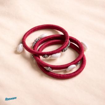 At the center lies a bold oxidized silver pendant with detailed craftsmanship, adding a touch of vintage sophistication. The matching red thread bangles, decorated with subtle shell embellishments, complete the set, making it perfect for festive occasions, cultural events, or casual ethnic styling.
