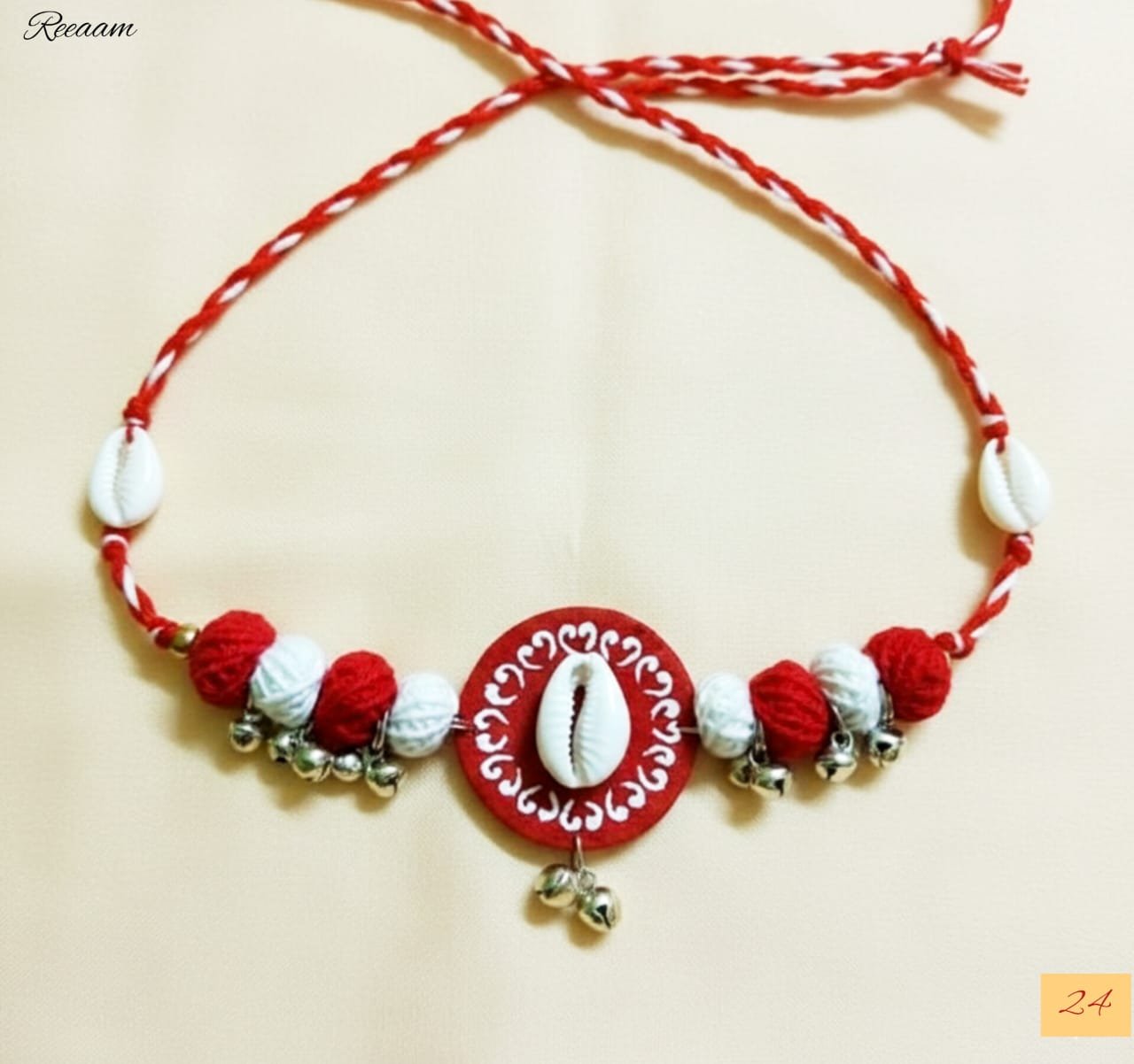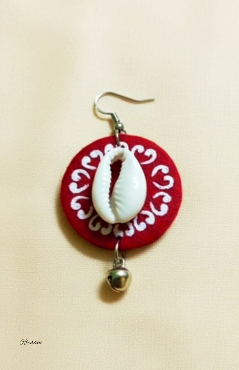 The necklace features a beautifully hand-painted red circular base adorned with a central cowrie shell, highlighted by delicate white motifs. Soft red-and-white twisted cotton threads form the adjustable tie-up, ensuring comfort and a perfect fit. Handcrafted fabric beads and tiny metallic ghungroo bells add a gentle rhythmic charm, enhancing its ethnic appeal.