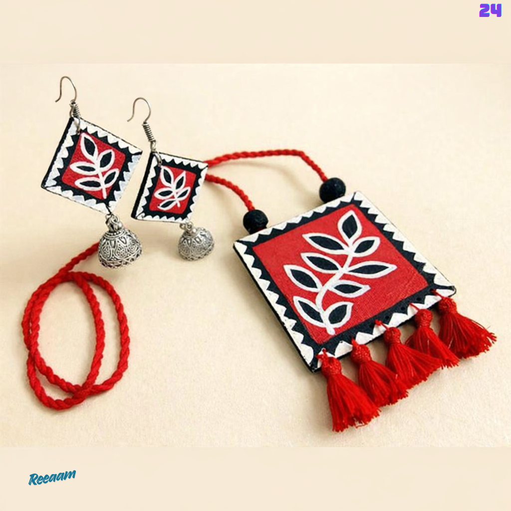 bold elegance with this stunning handcrafted artistic jewellery set, designed to make a statement. Featuring a striking red, black, and white leaf motif, this set beautifully blends traditional charm with contemporary style.