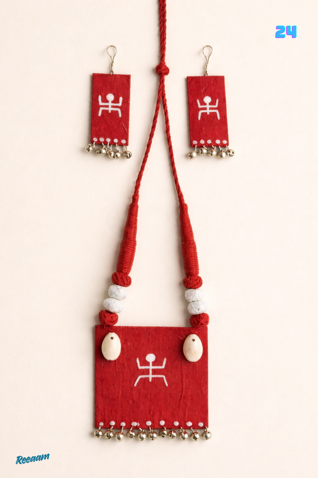 Elegant Red Tribal Handcrafted Jewellery Set with Bell Detailing