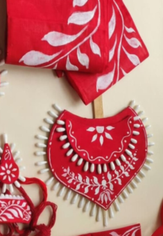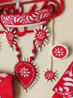 Celebrate the timeless beauty of Rabindra Nritya with this stunning red and white handcrafted jewellery set, inspired by classic Bengali artistry. Designed with intricate floral and leaf motifs, each piece reflects cultural grace and artistic elegance. The vibrant red base beautifully contrasts with delicate white patterns, creating a striking and graceful look perfect for dance performances and festive occasions.