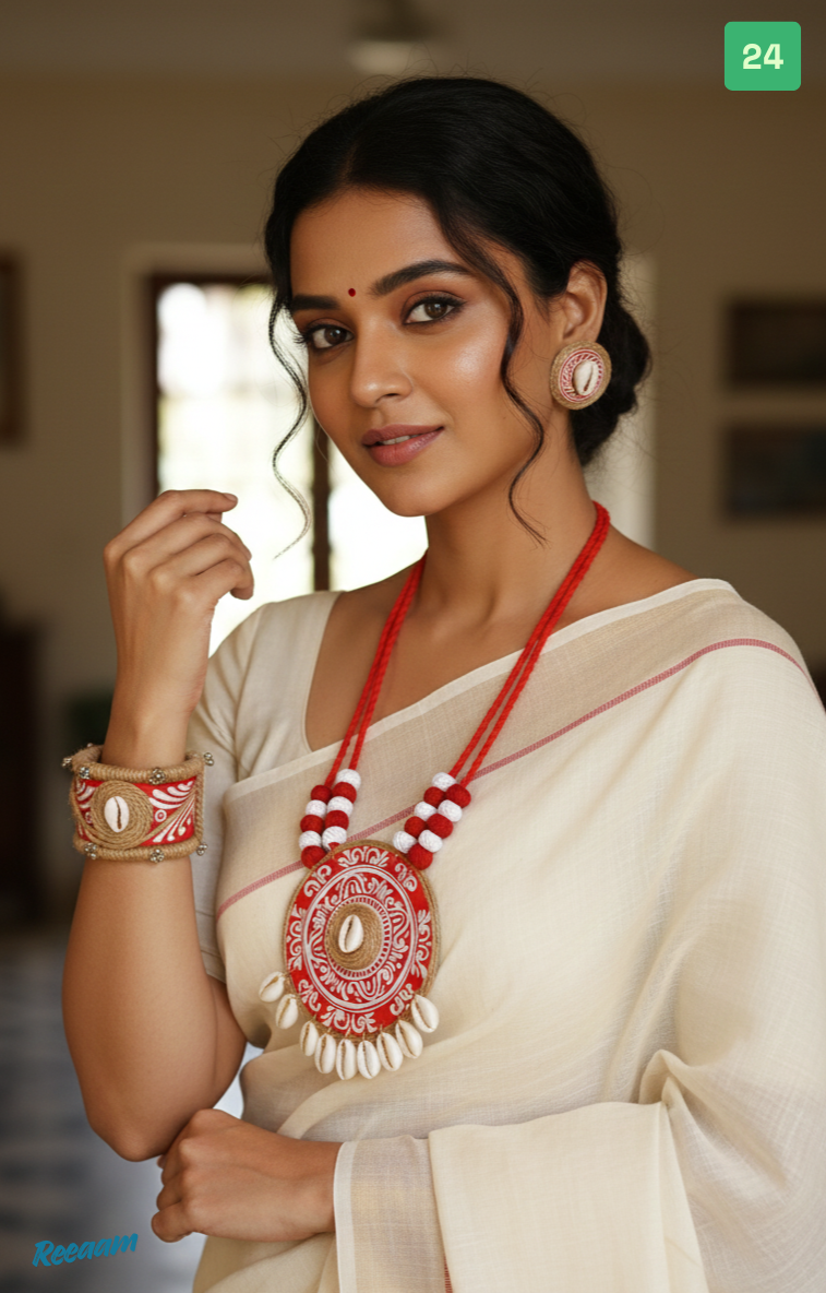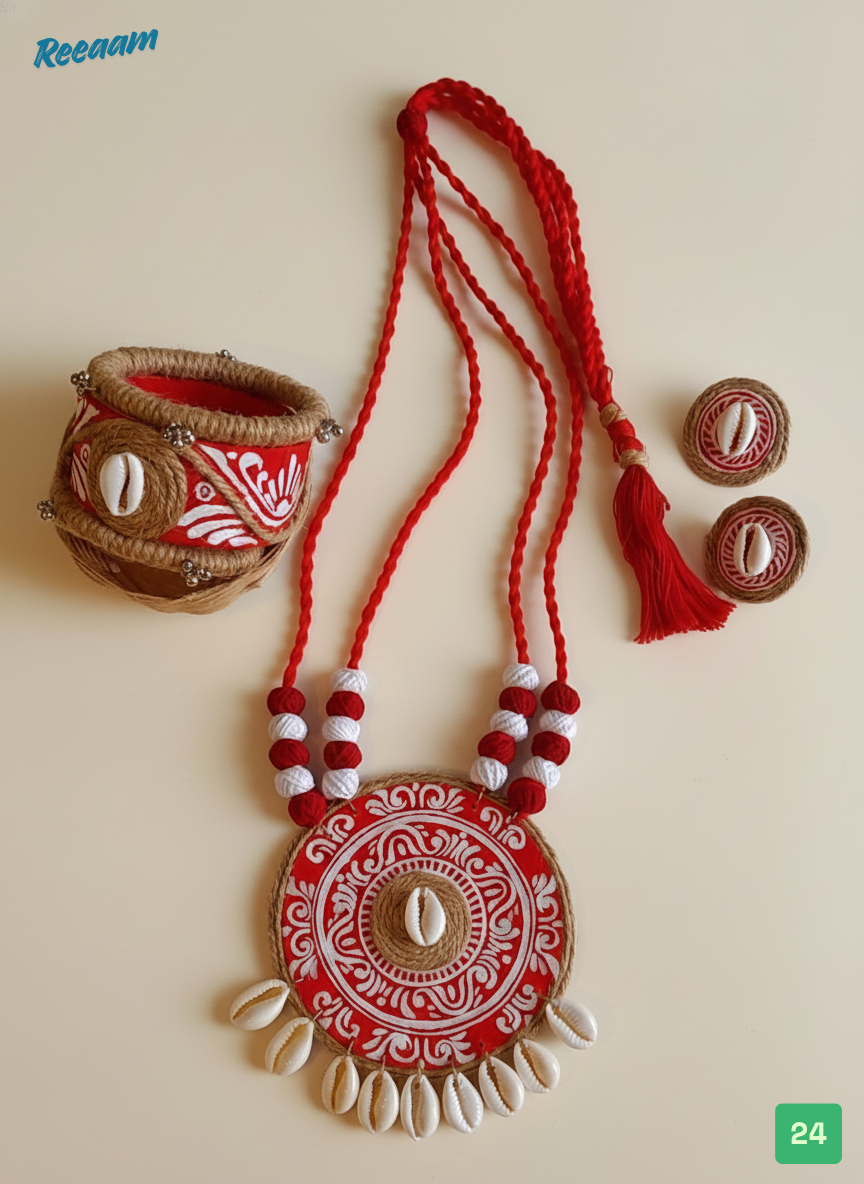 This stunning handcrafted jewellery set is a beautiful blend of traditional artistry and natural materials. Designed using eco-friendly jute, vibrant red cotton thread, and authentic cowrie shells, the set reflects a rich tribal and folk aesthetic.