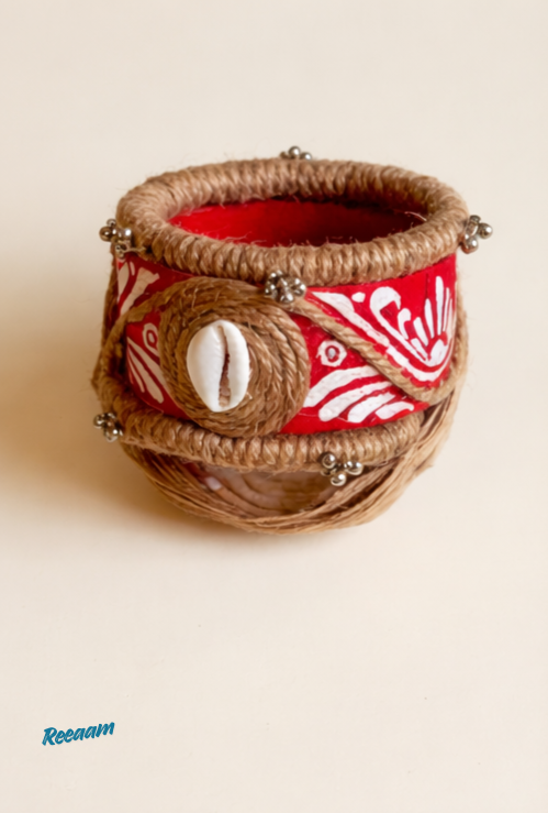 matching jute bangle: is wrapped with natural fiber and highlighted with hand-painted red accents and cowrie shell embellishments, giving it a rustic yet elegant look.