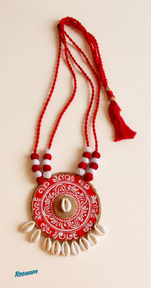 statement necklace: features a bold circular pendant adorned with intricate hand-painted motifs and finished with delicate cowrie shell drops, symbolizing prosperity and heritage. The braided red thread chain with tassel detailing adds a graceful, earthy charm.