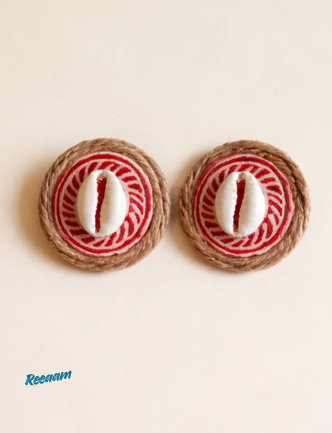 coordinated stud earrings: crafted with jute borders, hand-painted designs, and central cowrie shells for a perfectly balanced finish.