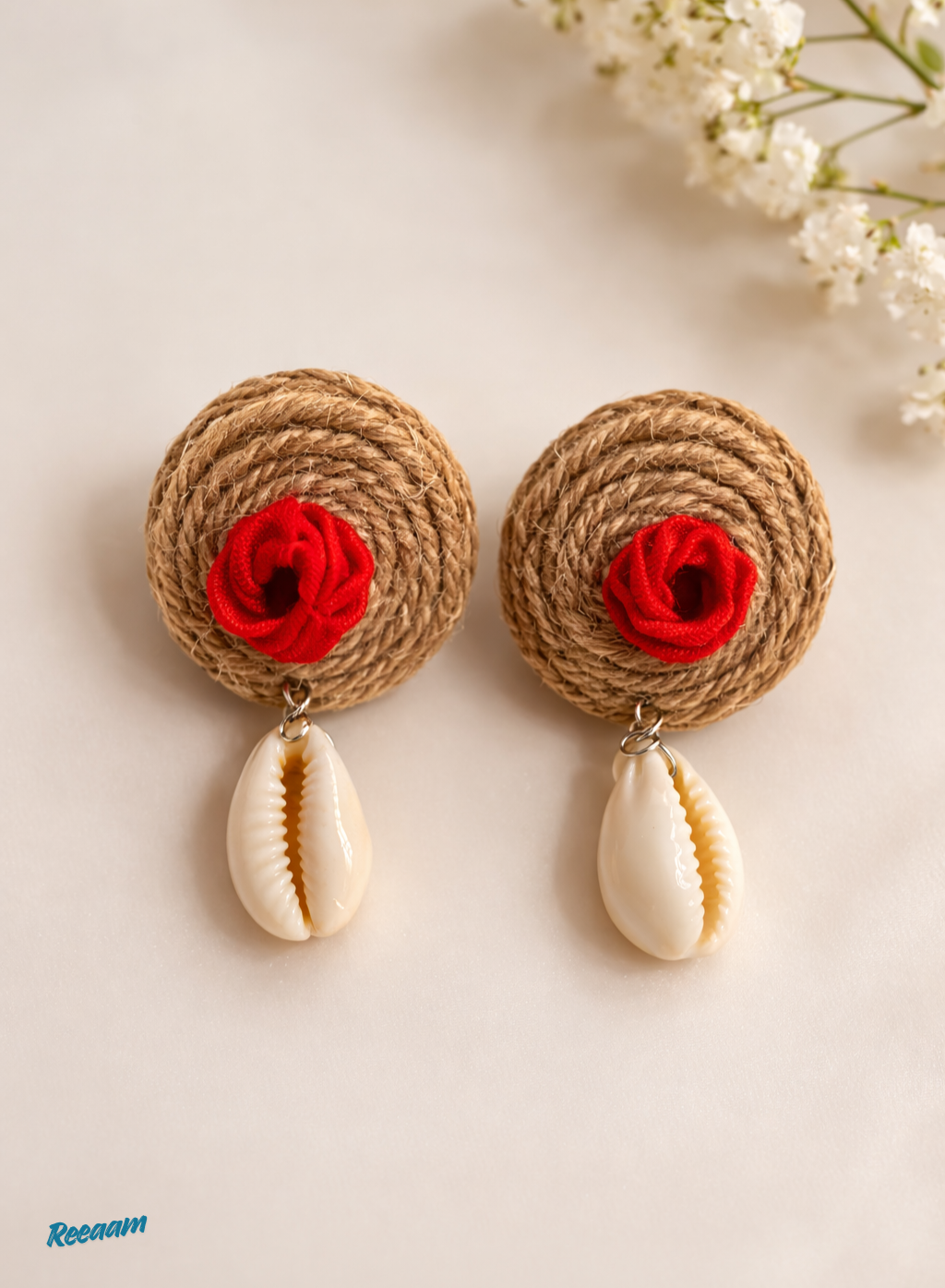 The set features a stylish necklace and matching earrings made with eco-friendly jute circles, decorated with delicate red fabric roses and natural white cowrie shells. The black thread cord enhances the rustic charm while ensuring comfortable wear.