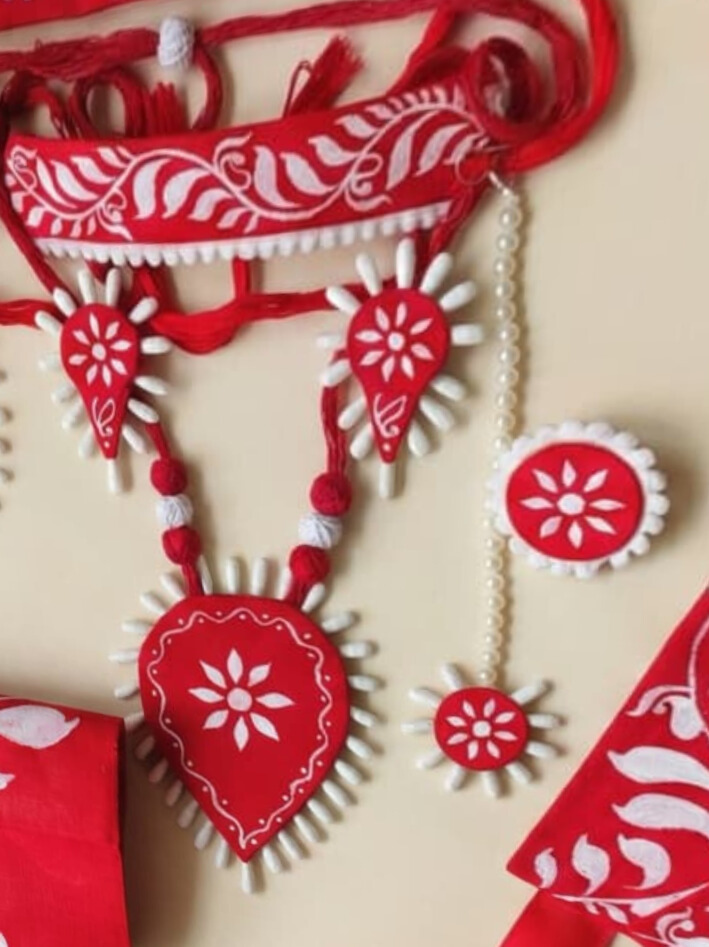 Some jewellery is worn… and some jewellery is felt . This beautiful Rabindra Nritya Jewellery Set carries the soulful essence of Bengali culture and graceful dance tradition. Crafted in the classic red and white combination, it instantly brings a festive warmth and artistic charm that perfectly complements Rabindra Nritya performances.