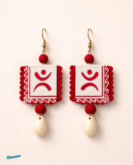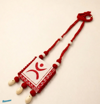 Celebrate tradition with this beautiful handcrafted jewellery set inspired by cultural artistry. The set features a striking red and white design with a bold artistic motif at the center, symbolizing energy and positivity. The necklace is carefully crafted with soft red threads, decorative beads, and elegant cream drop accents that add a graceful touch to the overall look.