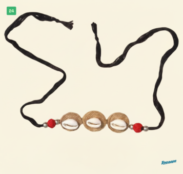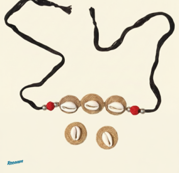 Celebrate earthy elegance with this beautifully handcrafted cowrie shell jewellery set. Designed using natural cowrie shells wrapped in rustic jute thread, this set reflects a perfect blend of traditional charm and contemporary minimalism. The necklace features a striking arrangement of cowrie shells accented with subtle red and metallic beads, tied together with soft black adjustable threads for a comfortable and customizable fit.