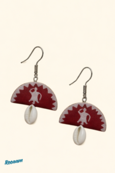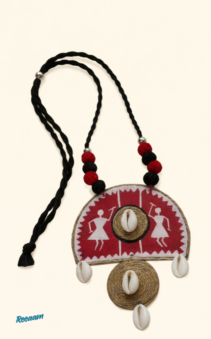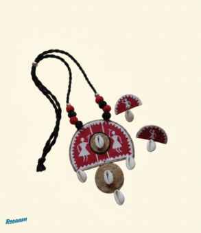 The necklace features a striking red and beige fabric pendant adorned with traditional Warli-style figures, neatly finished with braided thread work and shell embellishments that add a rhythmic, organic touch. Matching earrings echo the same design language, creating a perfectly coordinated look.