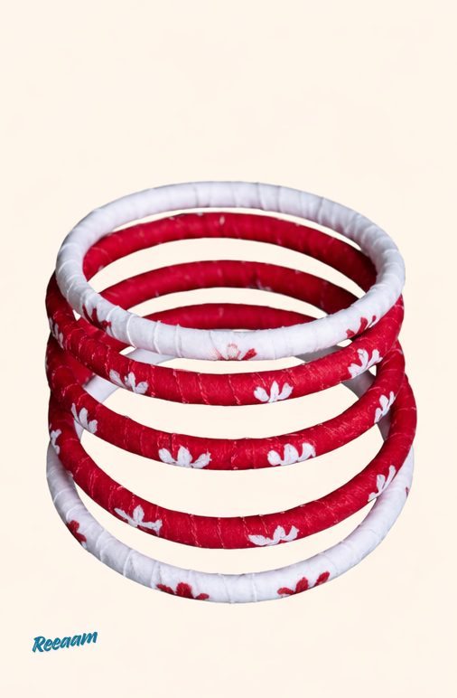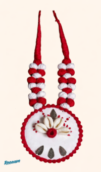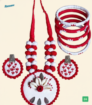 Add a touch of ethnic elegance to your look with this beautifully handcrafted red and white jewellery set. Made with fabric-wrapped beads and detailed hand embroidery, this set reflects traditional Indian craftsmanship with a contemporary appeal.