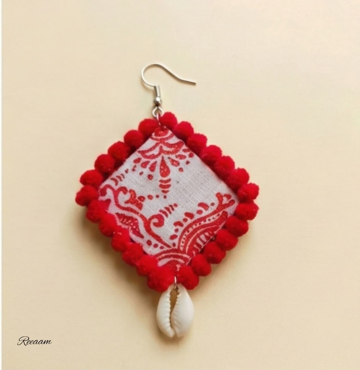 ​Earrings: A pair of matching diamond-shaped fabric earrings, each with red tribal patterns, a red pom-pom border, and a single cowrie shell drop. They are finished with silver-toned fish hook wires.