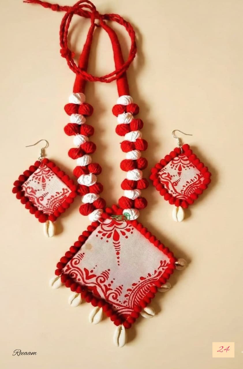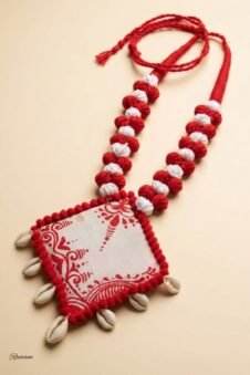 ​Necklace: The centerpiece is a large, diamond-shaped pendant made from white fabric with intricate red tribal patterns and a red pom-pom border. It is adorned with dangling cowrie shells along the bottom edge. The necklace chain is crafted from alternating red and white wrapped fabric beads and leads to a red thread tie closure.