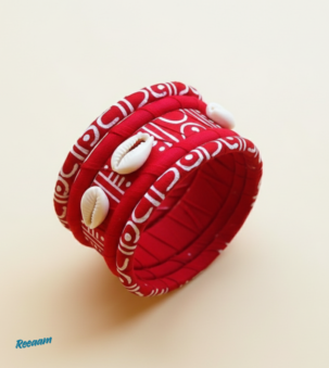 The vibrant red base symbolizes energy and auspiciousness, while the white tribal motifs and shells add a rustic, ethnic charm.