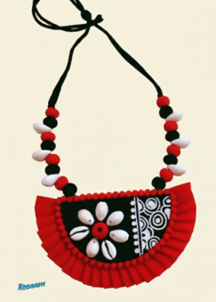 The Necklace: A semi-circular fabric pendant serves as the centerpiece, featuring a hand-painted floral motif adorned with genuine Cowrie shells. The right side of the pendant showcases intricate white mandala-style line art, bordered by a pleated red fabric frill and delicate pom-pom trim.