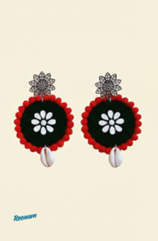 The Earrings: Matching circular studs echo the pendant’s design. They feature a central white flower motif, a red pom-pom border, and a single dangling shell. The earrings are finished with elegant silver-toned floral metal toppers.