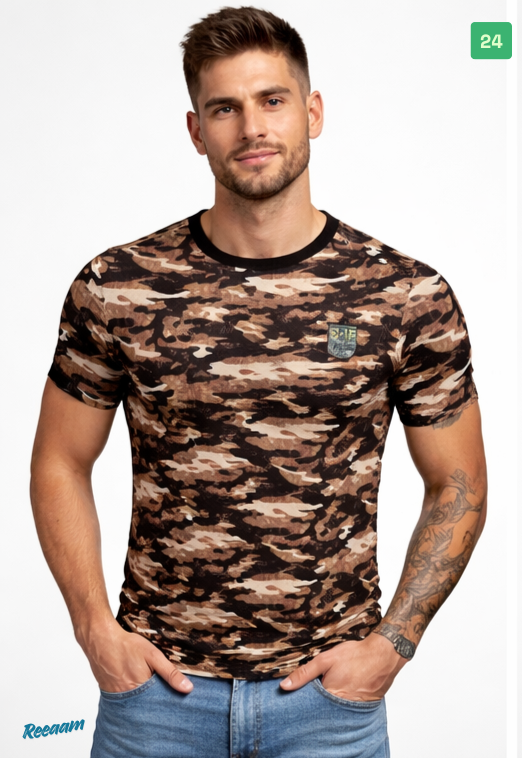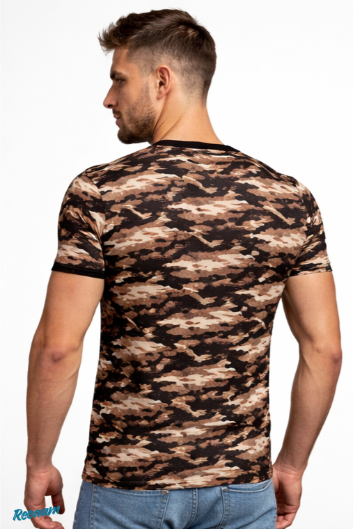 Upgrade your everyday style with this trendy camouflage print t-shirt. Designed with a classic crew neck and short sleeves, this t-shirt features a bold brown, beige, and black camo pattern that adds a rugged, modern edge to your look. Crafted from soft, breathable fabric, it ensures all-day comfort whether you’re heading out with friends or relaxing at home.