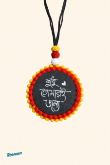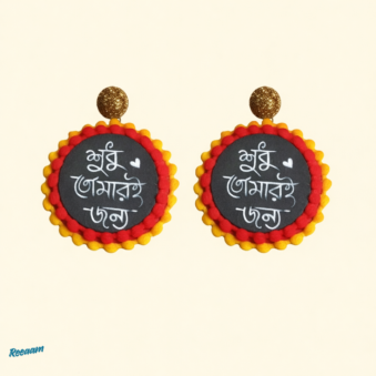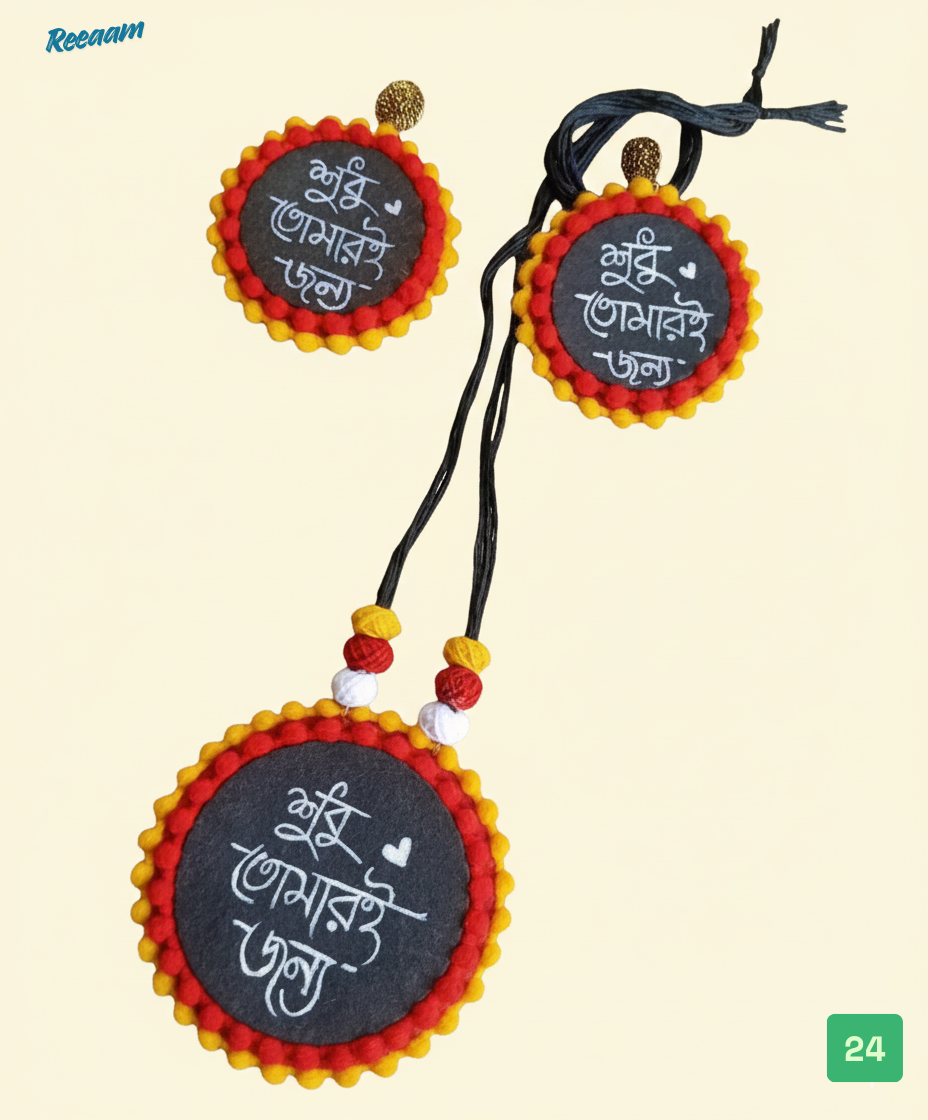 This beautiful handmade jewellery set features a unique round pendant necklace paired with matching earrings, thoughtfully crafted to celebrate culture and emotion. Each piece showcases elegant Bengali calligraphy written on a dark base, highlighted with a charming heart motif that adds a personal, expressive touch.
