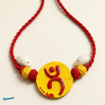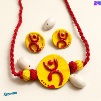 Celebrate creativity and culture with this beautiful handcrafted artistic jewellery set. Designed with vibrant yellow circular pendants highlighted by bold red abstract motifs, this unique set reflects a modern ethnic charm.