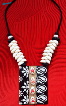 Featuring a bold rectangular wooden pendant adorned with traditional white motifs and symbolic shell detailing, the necklace is paired with matching handcrafted earrings for a complete ethnic look.