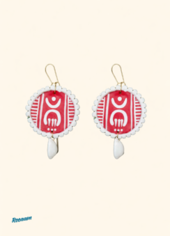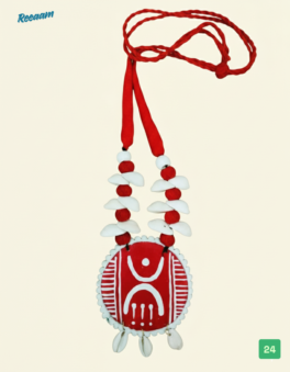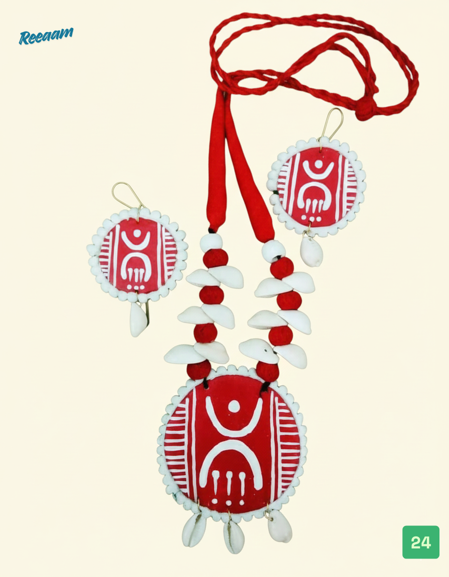Celebrate timeless tribal artistry with this beautifully handcrafted jewellery set. The set features a bold red pendant necklace paired with matching earrings, hand-painted with traditional ethnic motifs that reflect rich cultural heritage. The pendant is accented with natural white shell elements and soft fabric beads, strung together with a vibrant red thread for a striking yet earthy appeal.