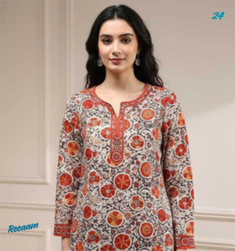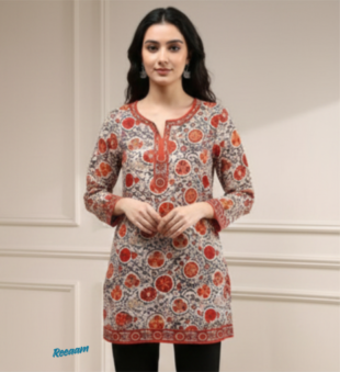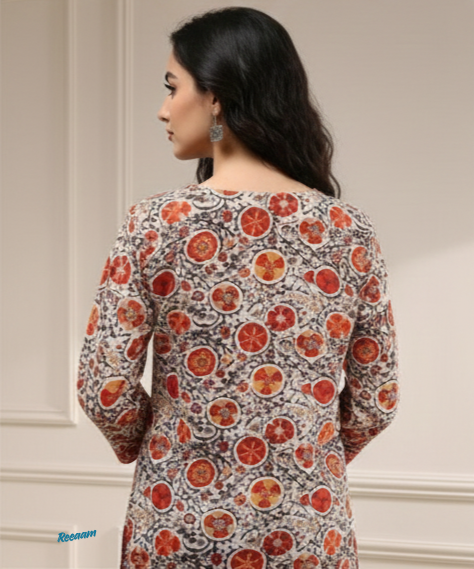 Revitalize your ethnic wardrobe with this stunning Red and Beige Floral Kurti. Inspired by traditional Kalamkari and Ajrakh motifs, this kurti features a vibrant medallion floral print set against a neutral cream background. Crafted from breathable, high-quality fabric, it is designed to keep you comfortable while looking effortlessly chic.