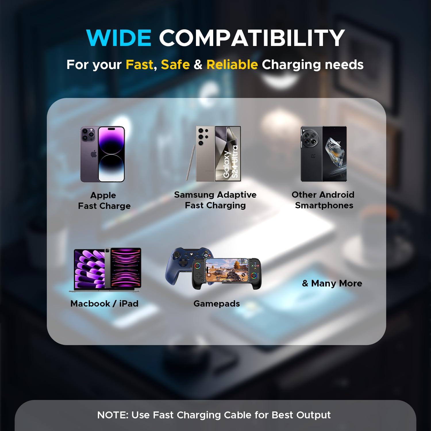 • 𝟰𝗫 𝗳𝗮𝘀𝘁 𝗰𝗵𝗮𝗿𝗴𝗶𝗻𝗴: Fast charging supported for Apple Fast Charge, Samsung Adaptive Fast charging, Huawei Fast Charge, Motorola TurboPower, Mi Fast Charge, Asus BoostMaster and others.