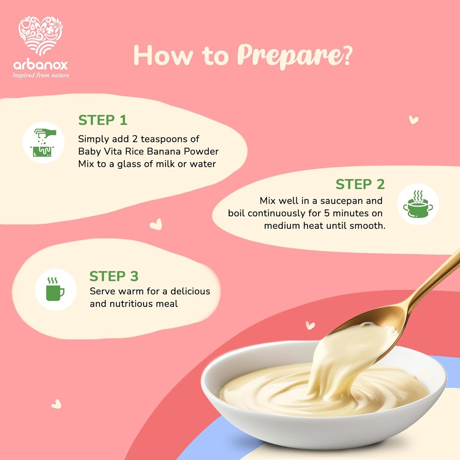 • Simply add two teaspoons of Rice Banana Powder Mix to a glass of milk or water, boil for five minutes, and serve warm. It’s that easy!
