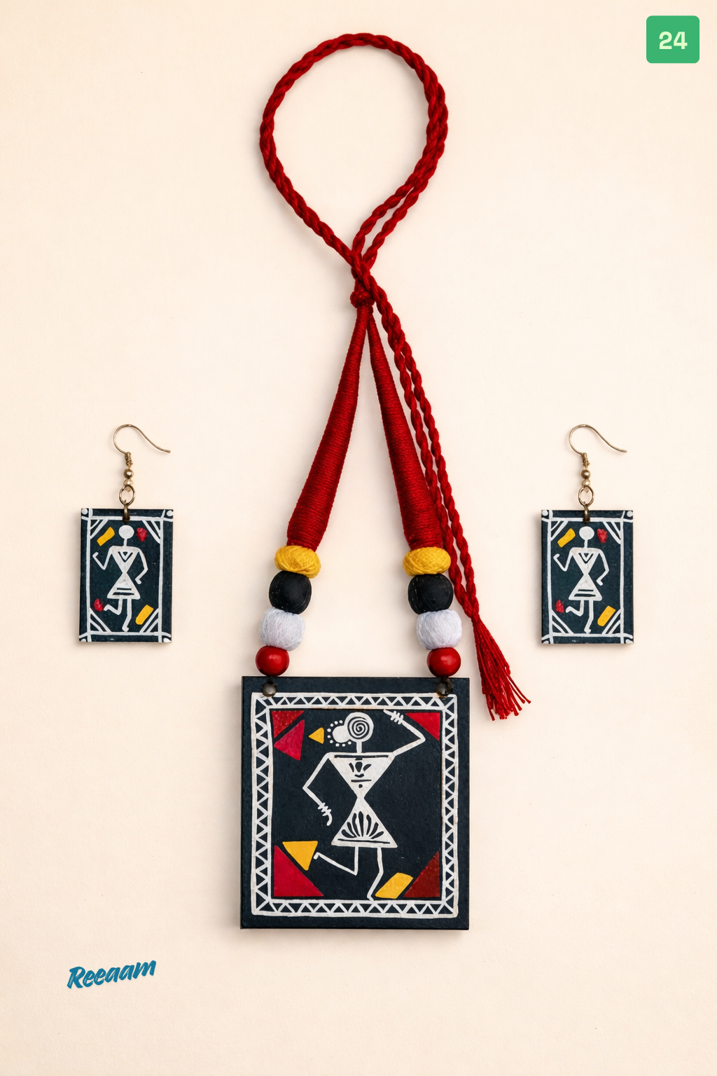 Handcrafted Warli Art Pendant Necklace Set with Matching Earrings