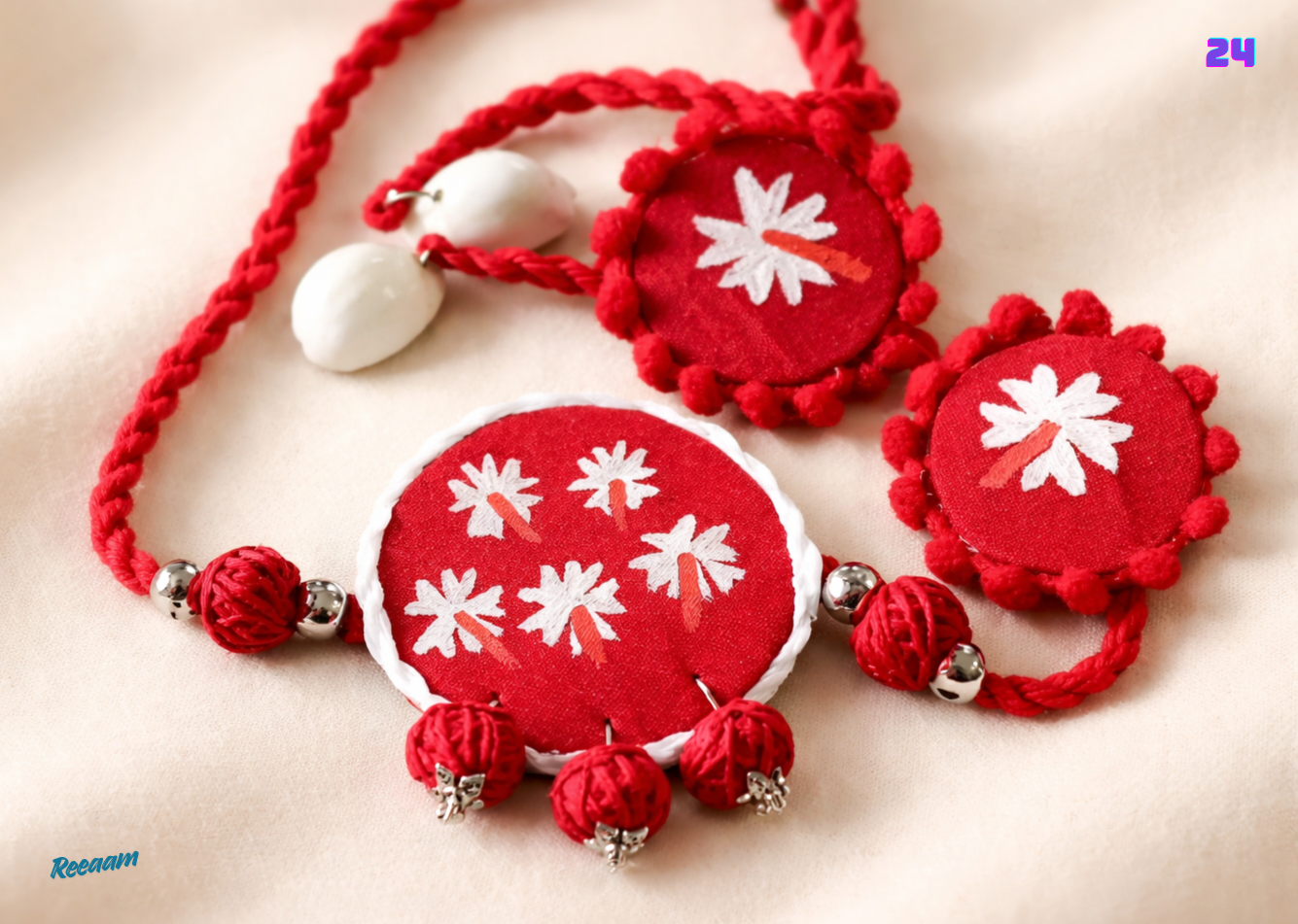 Handmade Fabric Necklace Set with Cotton Thread Balls Work and Fabric Work,