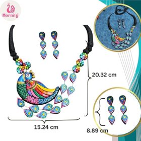 • HANDCRAFTED ARTISTRY: Beautiful terracotta necklace and earring set featuring a vibrant handpainted peacock design with multicoloured details and intricate patterns