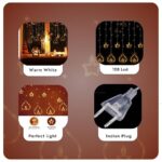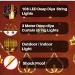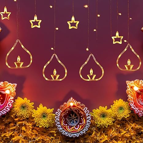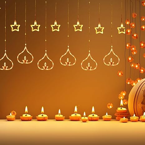 One94Store Deep Diya Curtain Decorative LED String Lights – 3 Meter Warm White Plug-in Lights with 108 LEDs, 6+6 Diya Design for Diwali