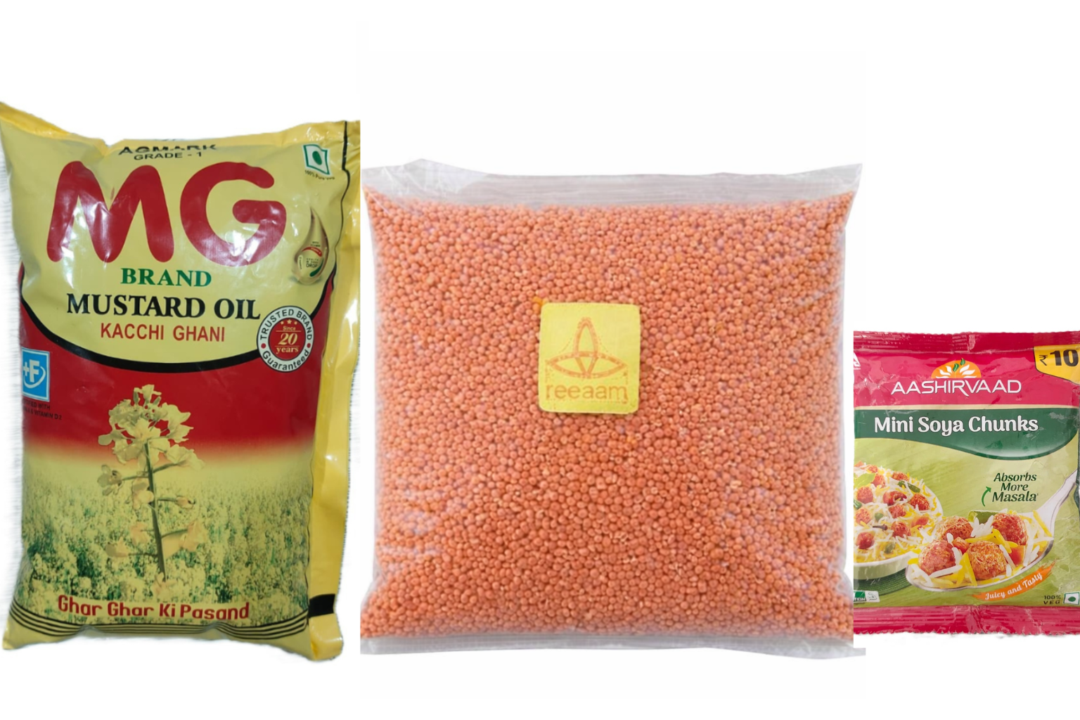 Pure Panghat masoor dal 1kg| Mg kacchi ghani mustard oil 1 ltr | Aashirvaad Soya Chunks Mini 40 gm