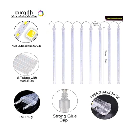 Rain Drop LED Meteor Shower 192 LEDs 8 Tubes (11.8″) | Icicle Falling Effect for Diwali, Christmas, New Year, Home & Outdoor Decoration