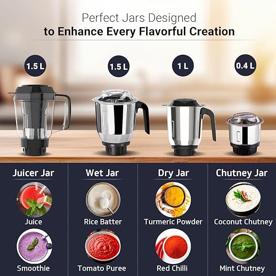 - VERSATILE JARS: The Mixer Grinder comes with a total of 4 versatile Jars. 3 food-grade and corrosion-free stainless steel jars, including juicer jar, dry jar ,wet jar, and a chutney jar. They cater to different grinding needs, allowing you to experiment and add versatility to your culinary creations.